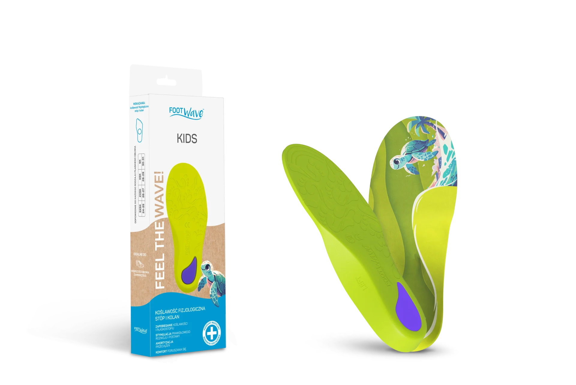 Pełne wkładki ortopedyczne FootWave KIDS to bezpieczne, medyczne wkładki ortopedyczne zaprojektowane z myślą o dzieciach, u których stwierdzono koślawość fizjologiczną stóp i kolan. Unikatowa budowa dynamicznych wkładek FootWave KIDS przywraca prawidłową pozycję stawu skokowego („kostki”), kolan i bioder, zwiększa stabilność i komfort poruszania się. Wkładki FootWave Kids mogą być stosowane profilaktycznie, aby zapobiegać powyższym dolegliwościom. Pomagają w okresie wzrostu i rozwoju dziecka. Dzięki korytkowej formule dobrze stabilizują tyłostopie i wymuszają poprawną postawę. Mogą być stosowane do każdego obuwia, także szkolnego i sportowego. W przypadku licznych dolegliwości stóp i szczególnych stanów chorobowych dziecka wskazana jest konsultacja z lekarzem lub specjalistą.
