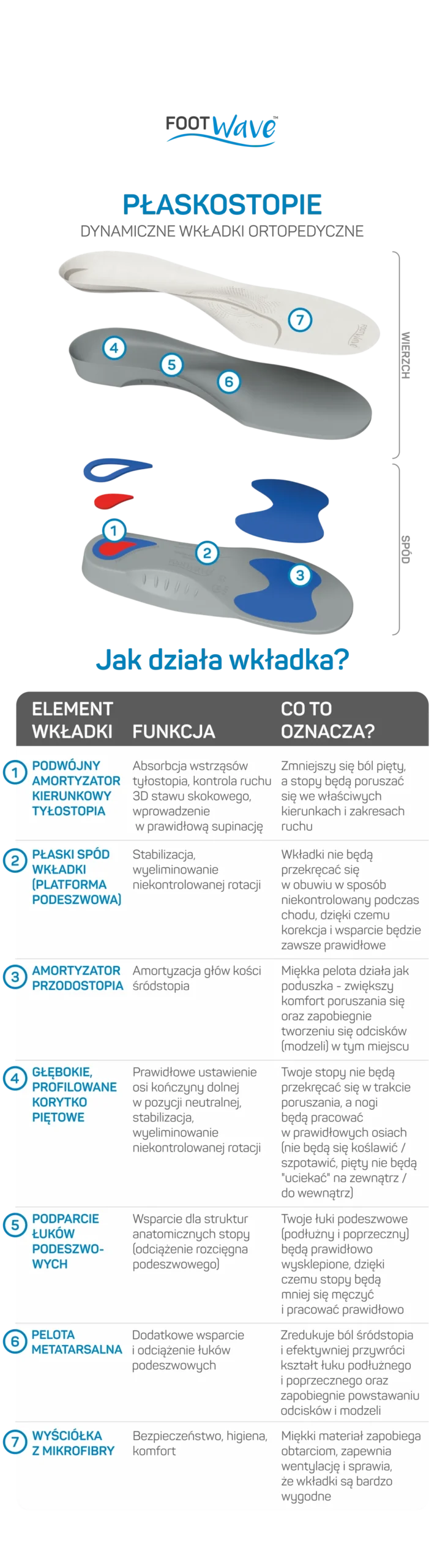 Dynamiczne wkładki FootWave PŁASKOSTOPIE stabilizują stopę, zwiększają komfort poruszania oraz redukują przeciążenia. Dzięki specjalnie zaprojektowanemu kształtowi stopa jest dobrze podparta, a pogłębione korytko zapewnia dodatkowe ustabilizowanie tylnej części stopy. Wkładki ortopedyczne FootWave mogą być stosowane zarówno w przypadku schorzeń, jak i w ramach profilaktyki występowania wady budowy stóp i postawy.