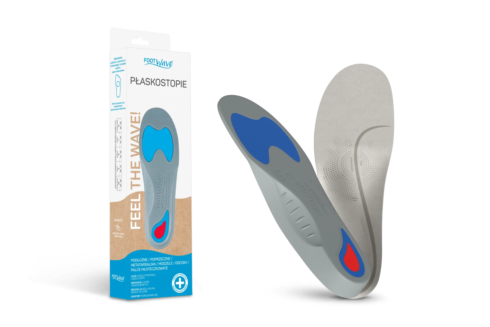 Dolegliwości bólowe związane z płaskostopiem utrudniają codzienne funkcjonowanie i znacząco wpływają na jakość życia. Wkładki ortopedyczne FootWave PŁASKOSTOPIE zostały zaprojektowane przez podiatrów (lekarzy specjalistów od stóp) w celu skorygowania nadmiernej pronacji, koślawości stóp i przede wszystkim opadających łuków podeszwowych. Pomagają zmniejszyć dyskomfort nadwyrężonych stóp oraz poprawiają ogólna postawę ciała. Zapewniają idealne biomechaniczne wsparcie podczas codziennych aktywności,