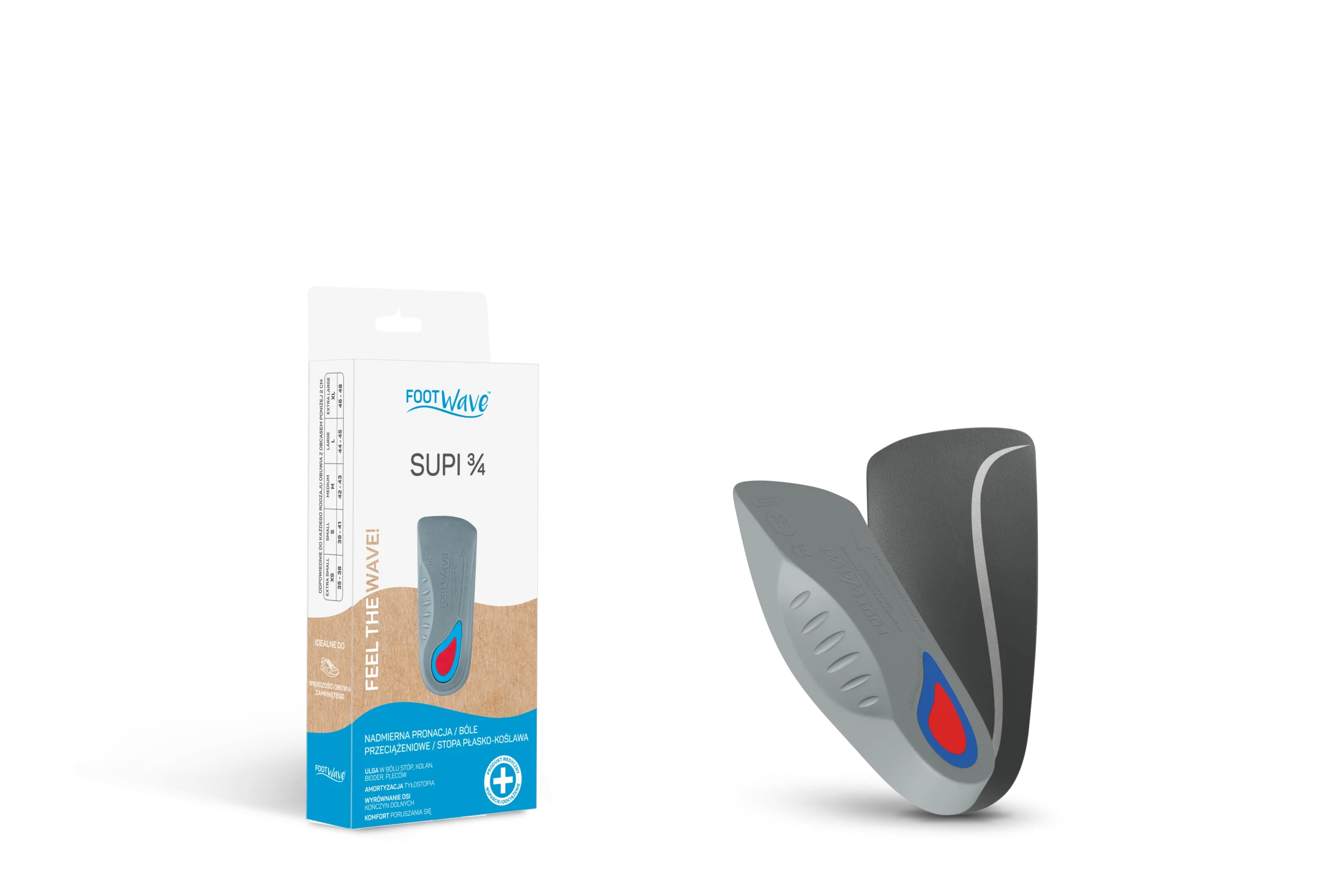FootWave SUPI 3/4 to dynamiczne wkładki ortopedyczne dla każdego, kto boryka się z z bólem stóp (w tym przede wszystkim pięt), koślawością oraz umiarkowanym płaskostopiem. Stanowią również świetną profilaktykę, dzięki stosowaniu której możemy uniknąć powyższych dolegliwości. To idealne wkładki ortopedyczne do codziennego użytku w pracy lub szkole.