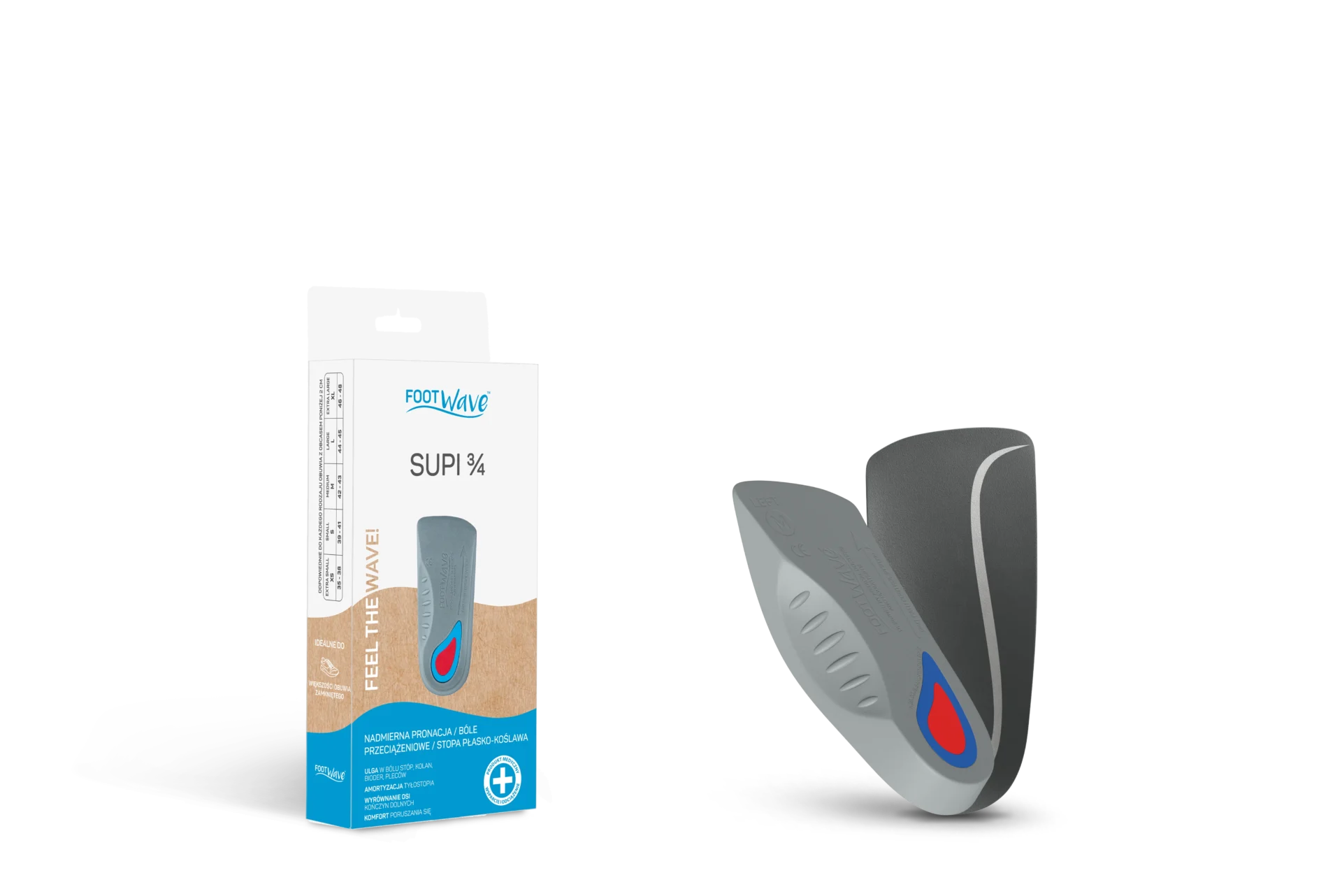FootWave SUPI 3/4 to dynamiczne wkładki ortopedyczne dla każdego, kto boryka się z z bólem stóp (w tym przede wszystkim pięt), koślawością oraz umiarkowanym płaskostopiem. Stanowią również świetną profilaktykę, dzięki stosowaniu której możemy uniknąć powyższych dolegliwości. To idealne wkładki ortopedyczne do codziennego użytku w pracy lub szkole.
